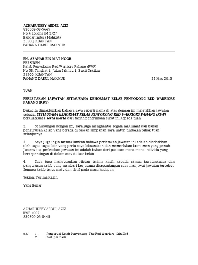Contoh Surat Perletakan Jawatan Setiausaha Persatuan Contoh Surat
