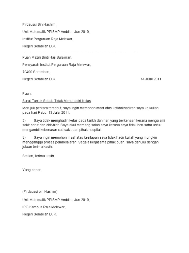 Surat Rasmi Tidak Hadir Ke Kuliah Kerana Sakit Rasmi B